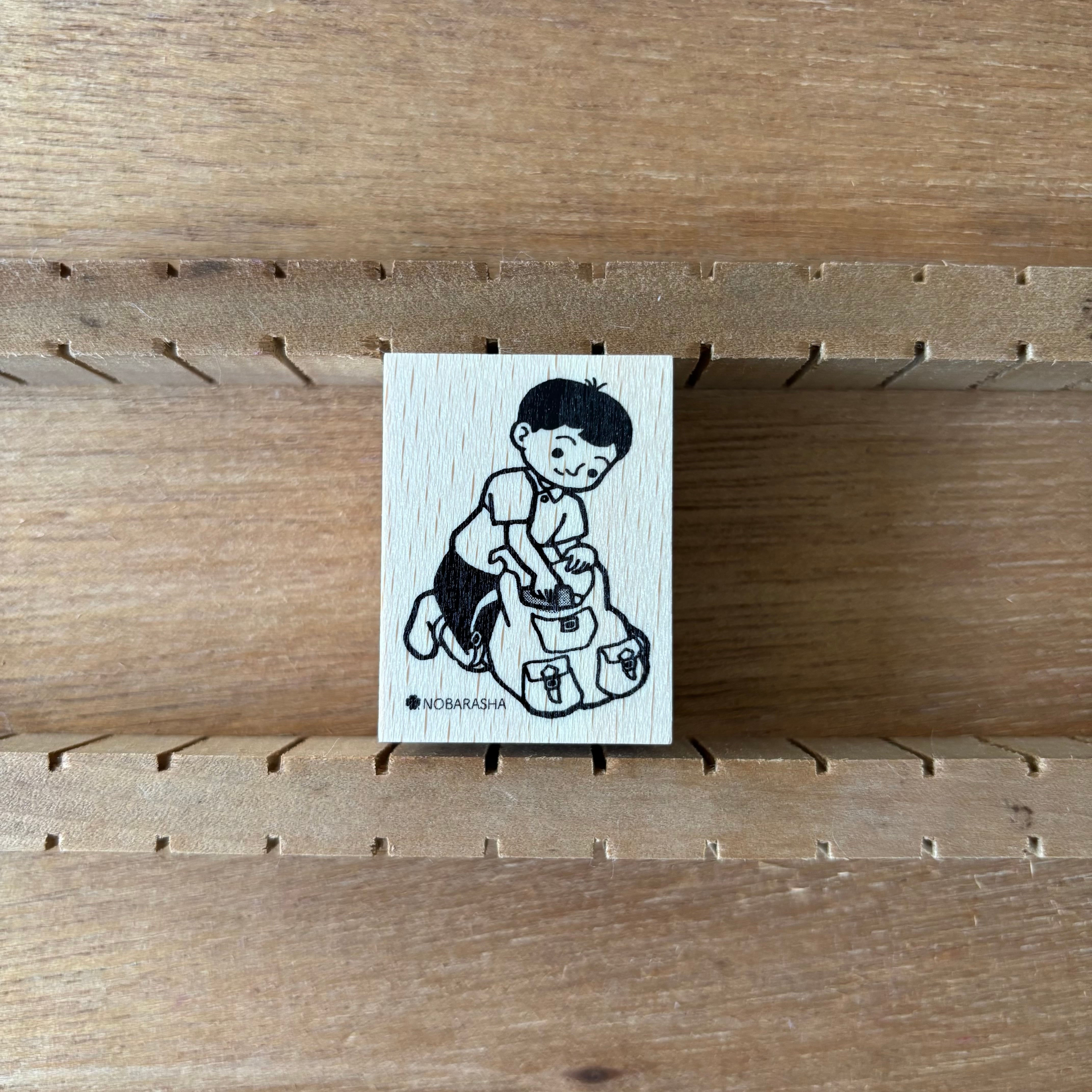 野ばら社の図案集より遠足の荷造りをする場面をはんこにしました。