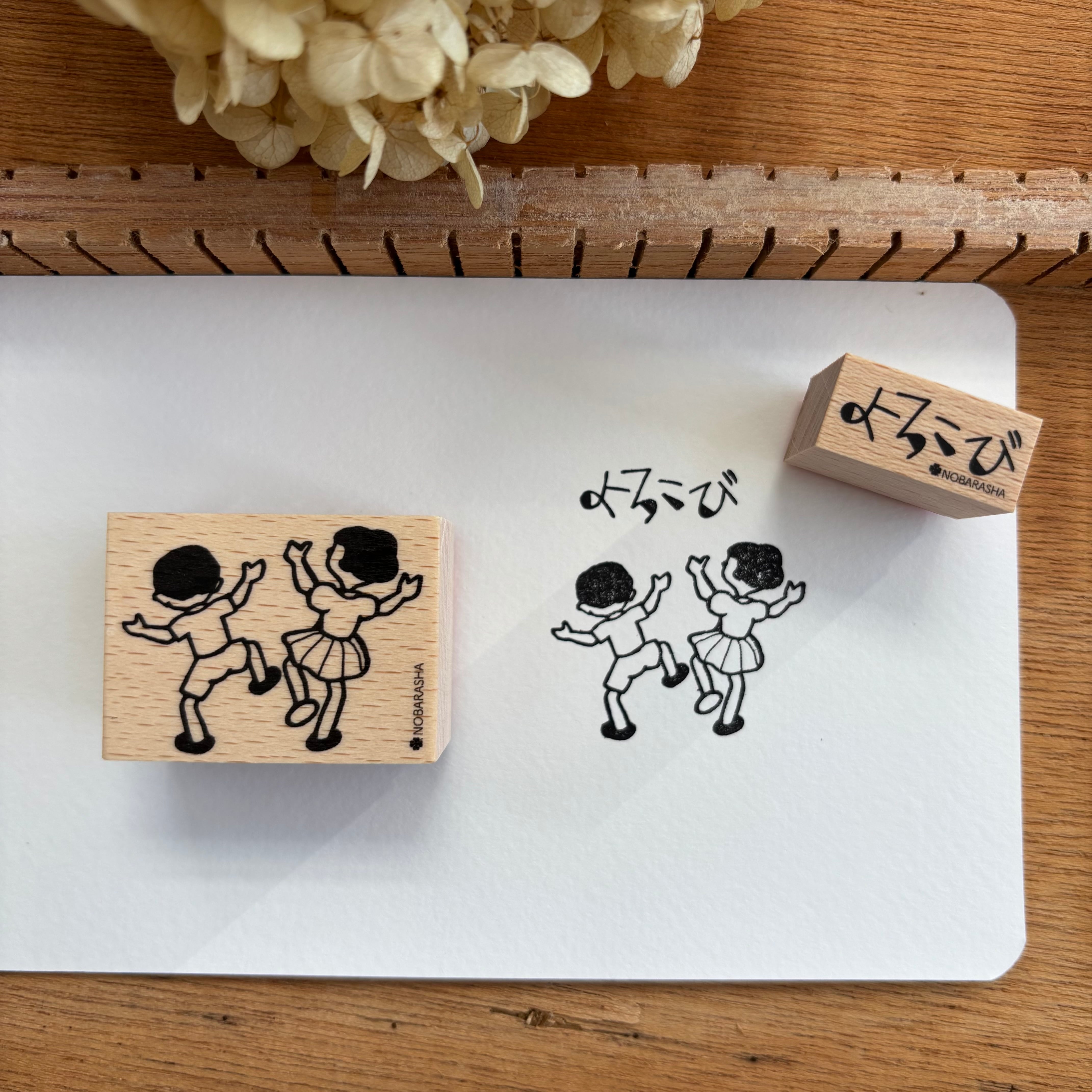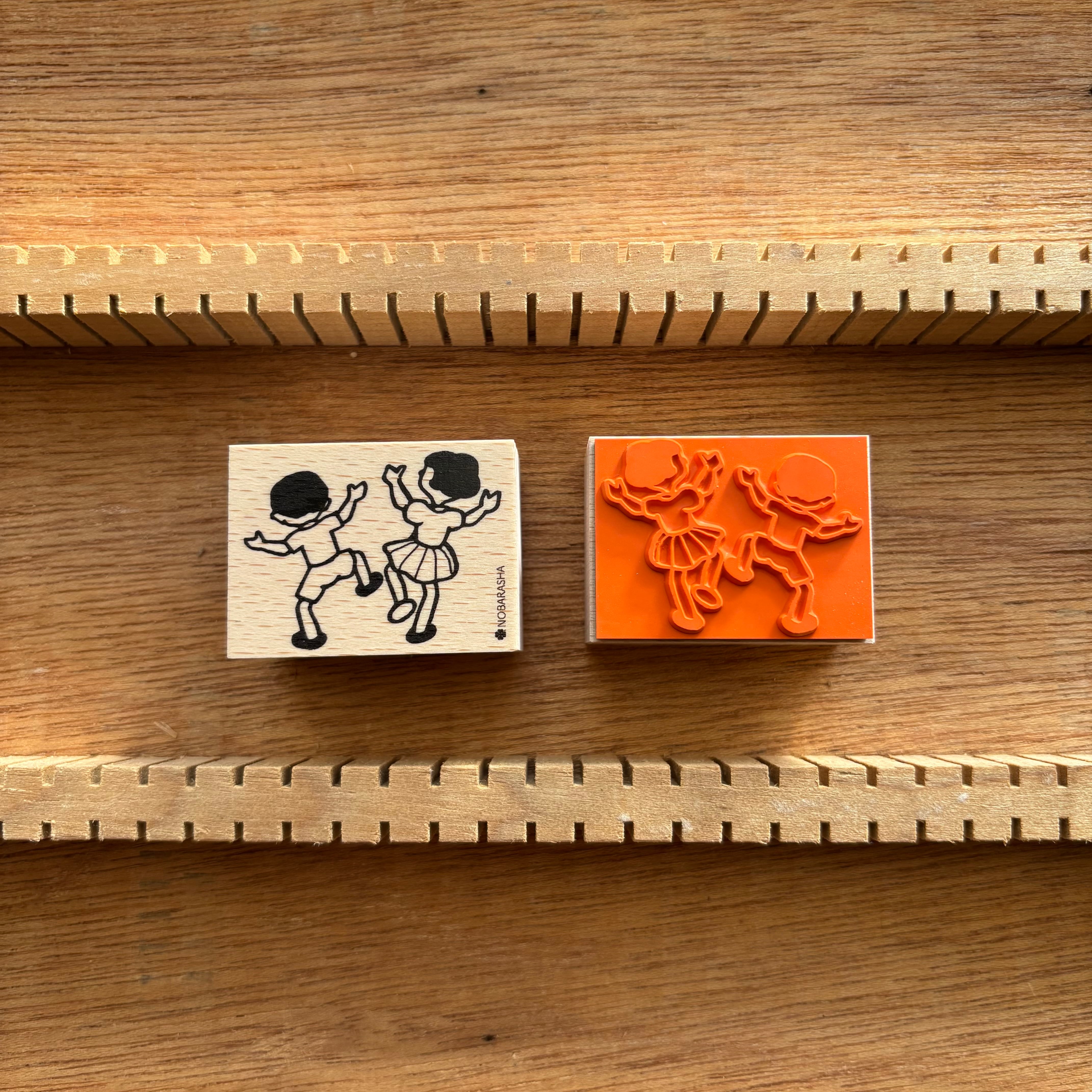 野ばら社の図案集より男の子と女の子が喜ぶ場面をはんこにしました。