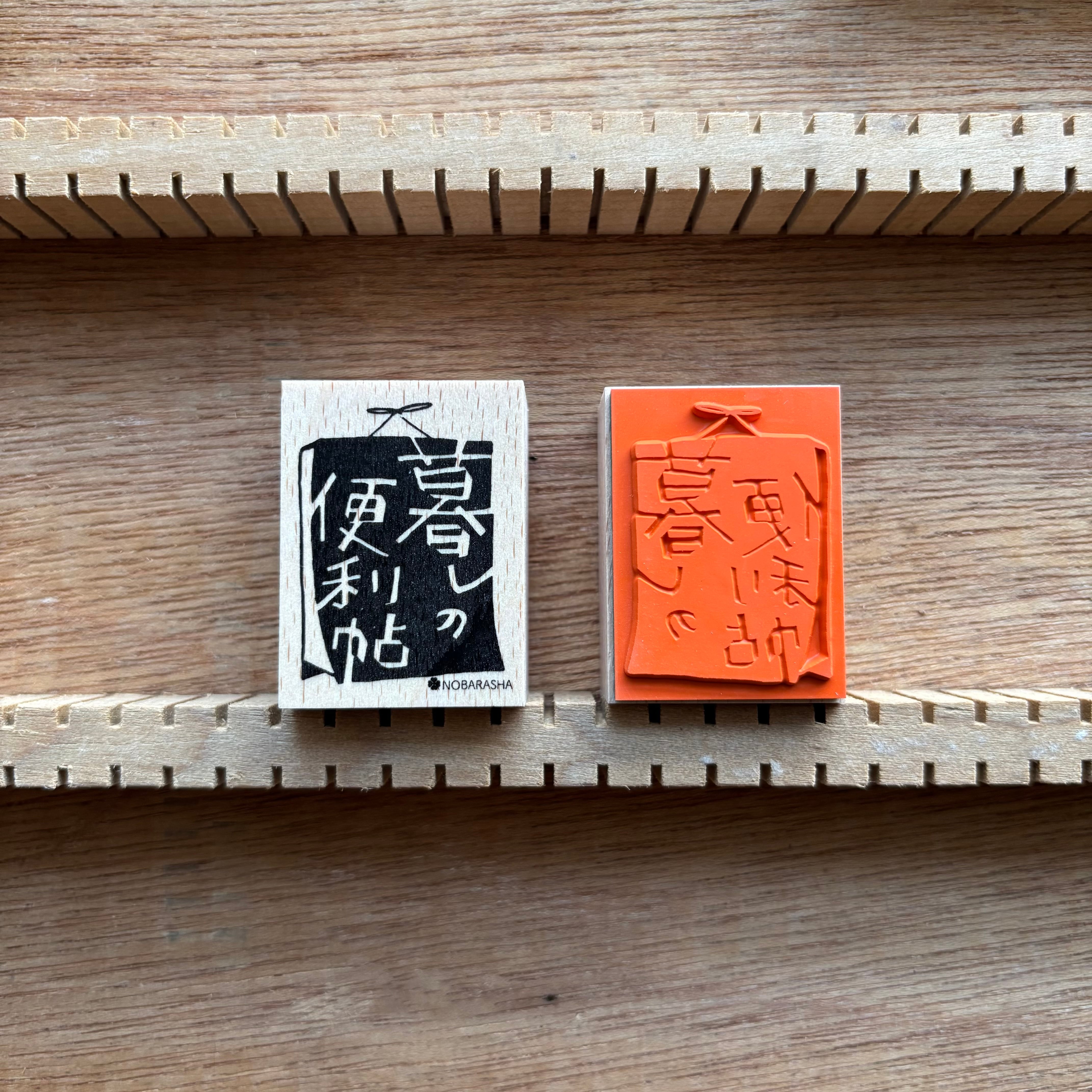 野ばら社の図案集より手描きの「暮らしの便利帖」の文字をはんこにしました。