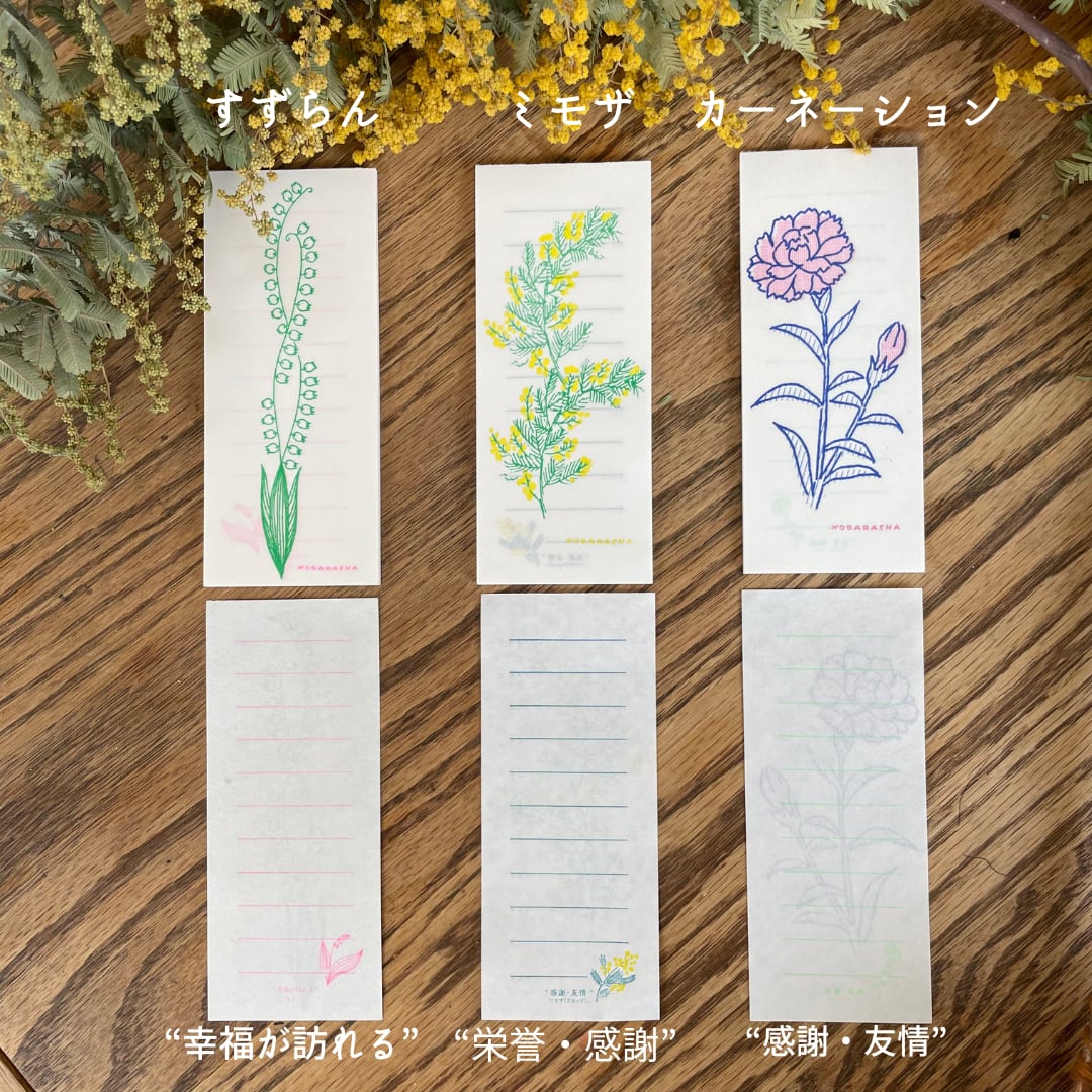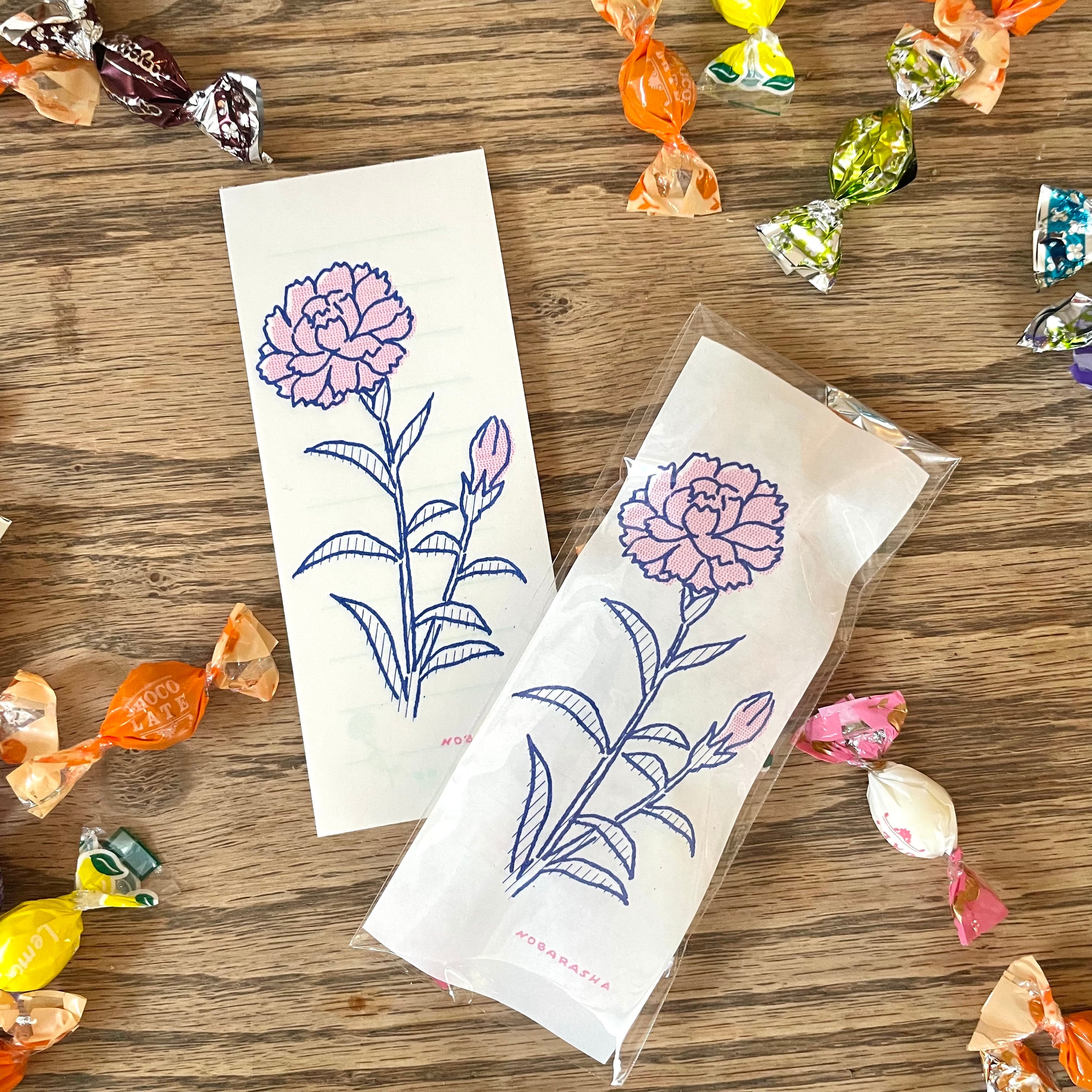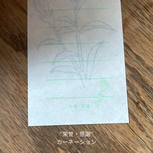 罫線の一番下には、野ばら社『花の手帖』より抜粋した「カーネーションの花言葉=“栄誉・感謝”」。