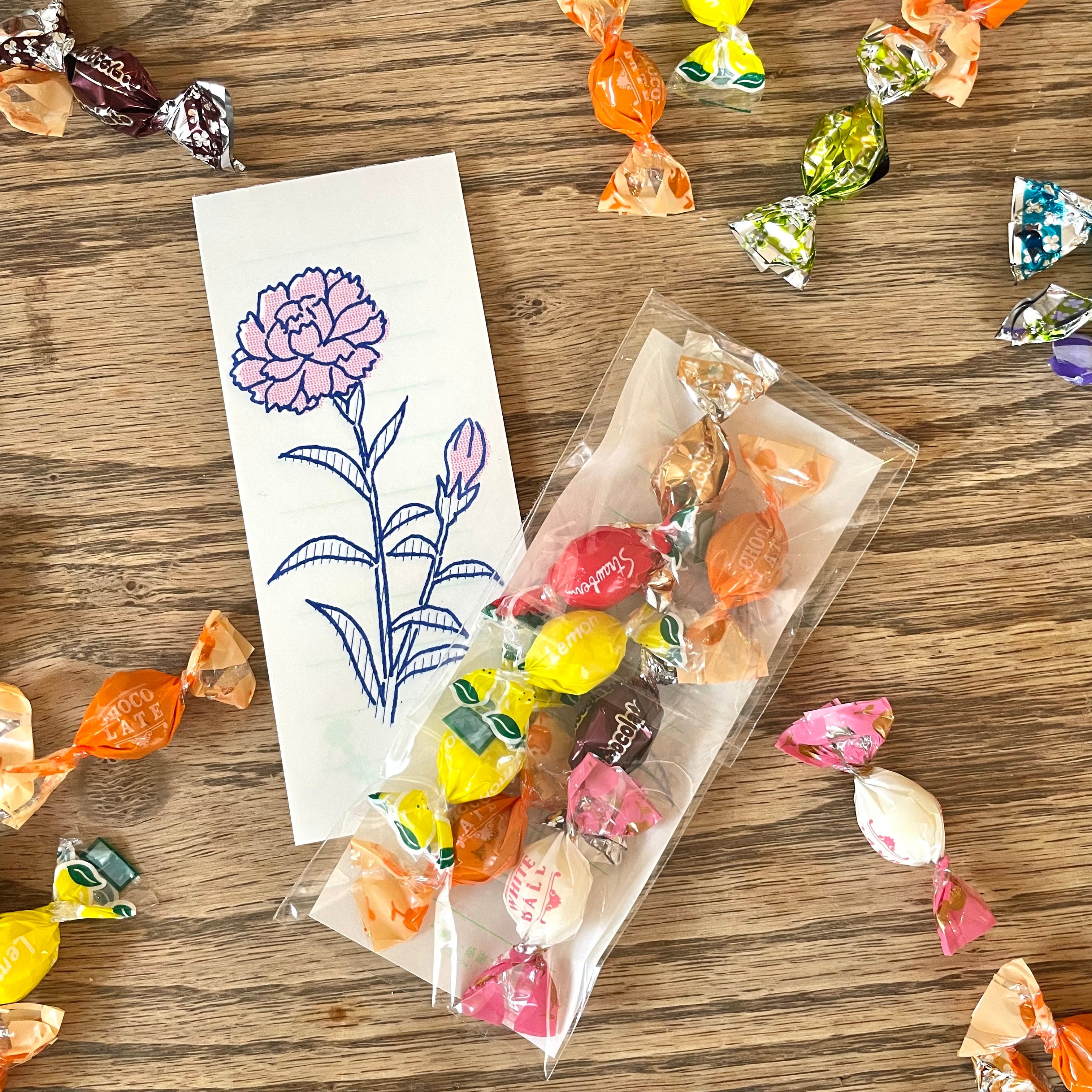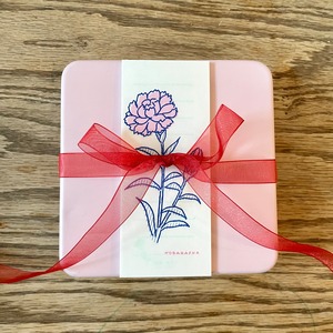 小分けの品に1枚入れるだけで花を一輪添えたようなラッピングが出来上がります。